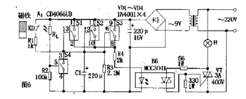 電路如圖6所示。A是四組模擬電子開關(S1~S4):S1,S2,S3并聯(可增加驅動功率及抗干擾能力)用于延時電路,當其接通電源后經R4,B6驅動雙向可控硅VT,VT直接控制門廳照明燈H;S4與外接光敏電阻Rl等構成環境光線檢測電路。當門關閉時,安裝在門框上的常閉型干簧管KD受到門上磁鐵作用,其觸點斷開,S1,S2,S3處于數據開狀態。晚間主人回家打開門,磁鐵遠離KD,KD觸點閉合。此時9V電源整流后經R1向C1充電,C1兩端電壓很快上升到9V,整流電壓經S1,S2,S3和R4使B6內發光管發光從而觸發雙向可控硅導通,VT亦導通,H點亮,實現自動照明控制作用。房門關閉后,磁鐵控制KD,觸點斷開,9V電源停止對C1充電,電路進入延時狀態。C1開始對R3放電,經一段時間延遲后,C1兩端電壓逐漸下降到S1,S2,S3的開啟電壓(1.5v)以下,S1,S2,S3恢復斷開狀態,導致B6截止,VT亦截止,H熄來,實現延時關燈功能。